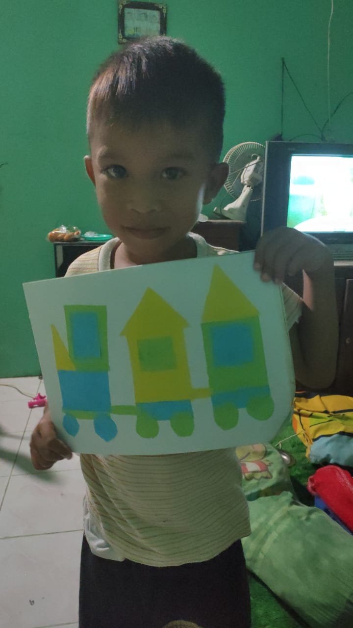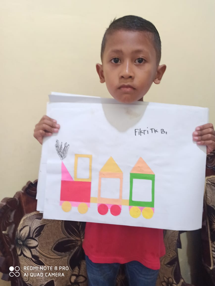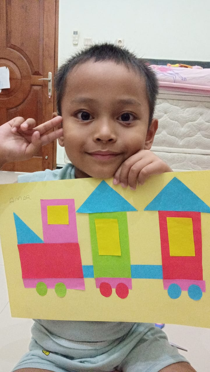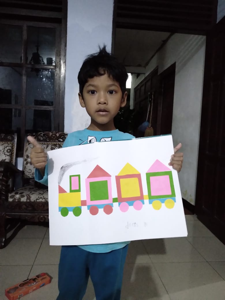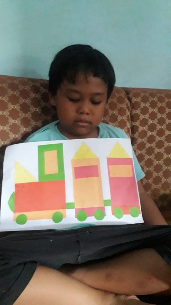 Menempel dan menggunting bentuk geometri bentuk kereta api TK interaktif harum mulia.