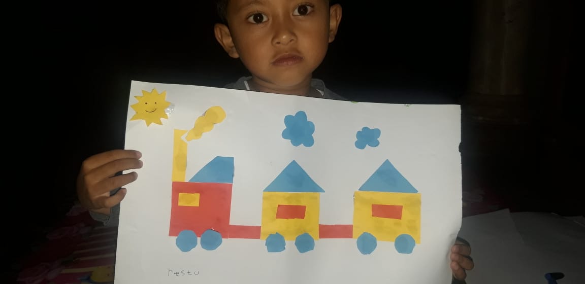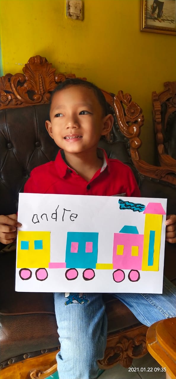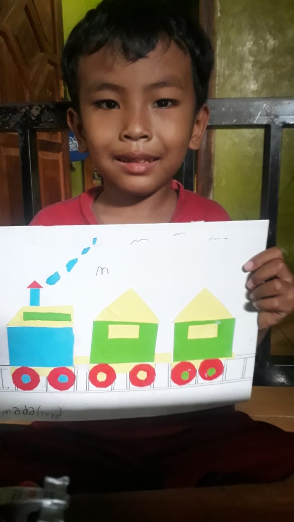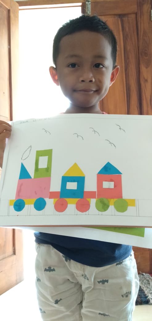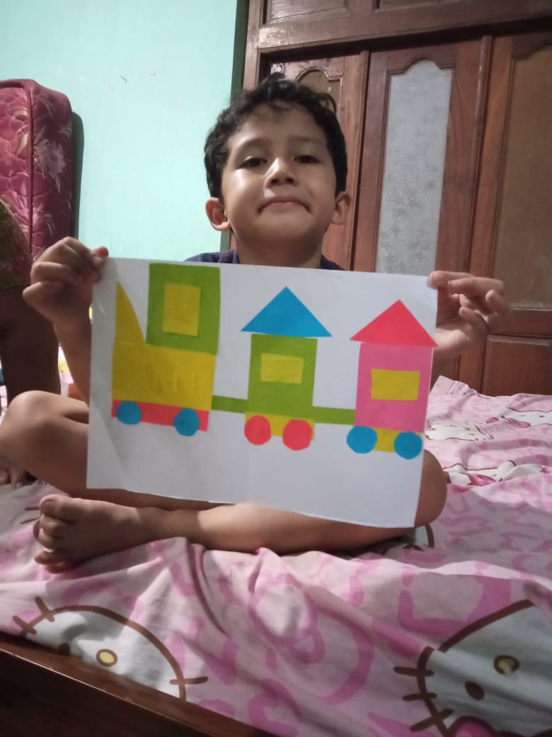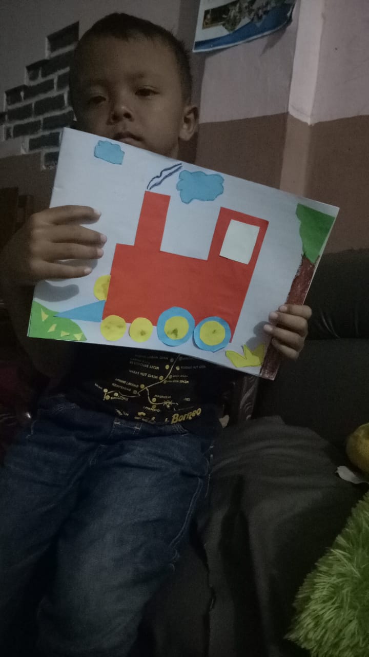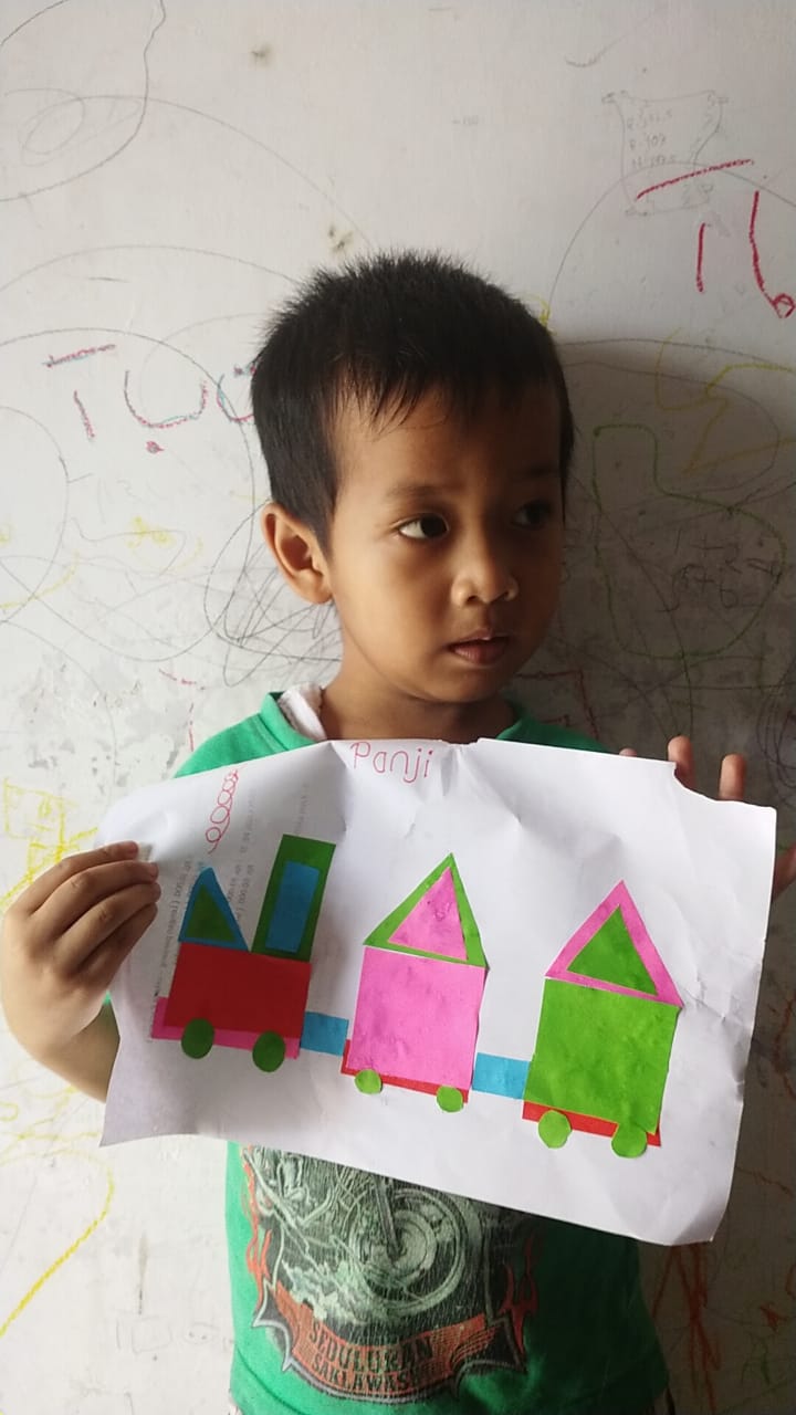Menempel dan menggunting bentuk geometri bentuk kereta api TK interaktif harum mulia.